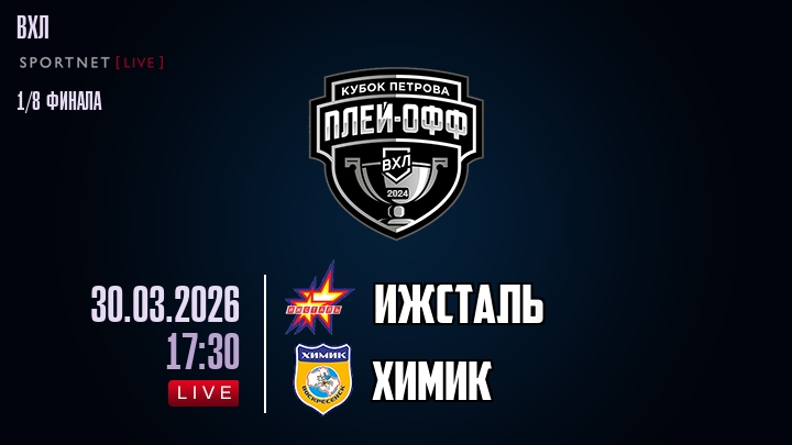 30 марта 2026 года, мы предлагаем посмотреть онлайн трансляцию хоккейного матча между хоккейным клубом Ижсталь и хоккейным клубом Химик, проходящего в рамках Серии 1/8 финала ПЛЕЙ-ОФФ чемпионата ВХЛ.