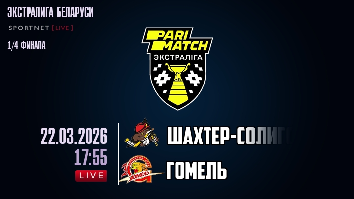 Сегодня, 22 марта 2026 года, мы предлагаем посмотреть онлайн трансляцию хоккейного матча между хоккейным клубом Шатер-Солигорск и хоккейным клубом Гомель, проходящего в рамках Серии 1/4 финала ПЛЕЙ-ОФФ Экстралиги Беларуси.