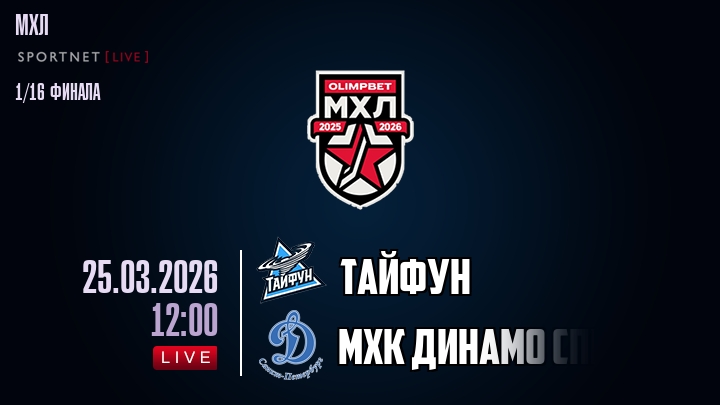 Сегодня, 25 марта 2026 года, состоялась онлайн трансляция хоккейного матча между хоккейным клубом Тайфун и хоккейным клубом МХК Динамо Спб, проходящего в рамках чемпионата МХЛ.