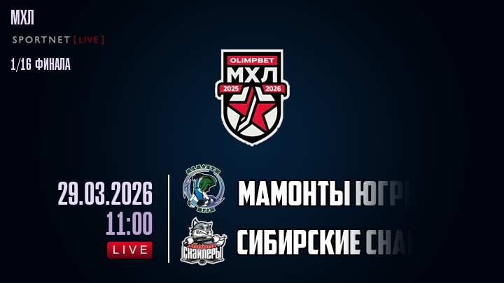 29 марта 2026 года, мы предлагаем посмотреть онлайн трансляцию хоккейного матча между хоккейным клубом Мамонты Югры и хоккейным клубом Сибирские Снайперы, проходящего в рамках чемпионата МХЛ.