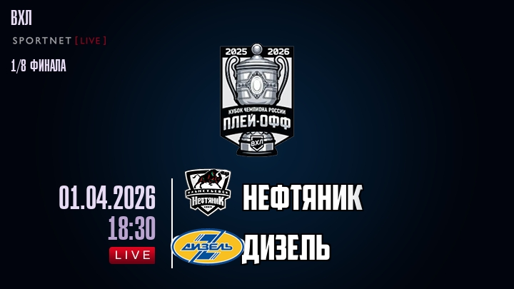 1 апреля 2026 года, мы предлагаем посмотреть онлайн трансляцию хоккейного матча между хоккейным клубом Нефтяник и хоккейным клубом Дизель, проходящего в рамках Серии 1/8 финала ПЛЕЙ-ОФФ чемпионата ВХЛ.