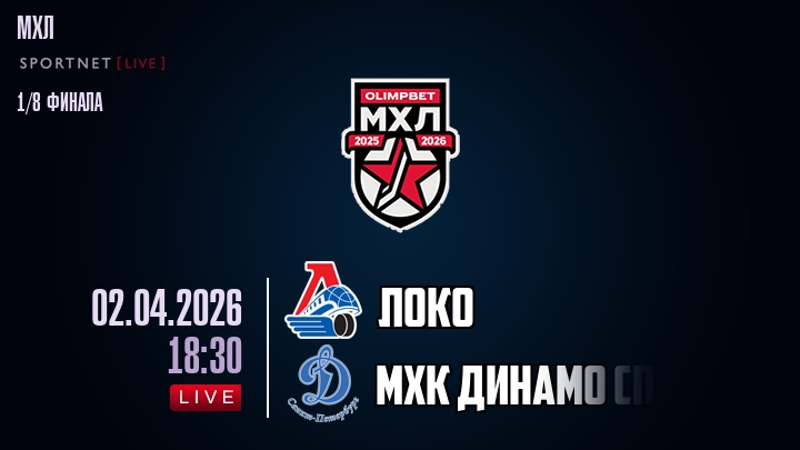 2 апреля 2026 года, мы предлагаем посмотреть онлайн трансляцию хоккейного матча между хоккейным клубом Локо и хоккейным клубом МХК Динамо Спб, проходящего в рамках Серии 1/8 финала ПЛЕЙ-ОФФ чемпионата МХЛ.