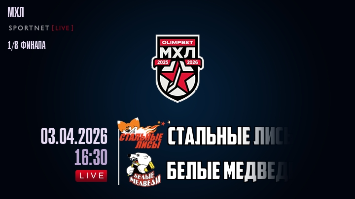 3 апреля 2026 года, мы предлагаем посмотреть онлайн трансляцию хоккейного матча между хоккейным клубом Стальные Лисы и хоккейным клубом Белые Медведи, проходящего в рамках Серии 1/8 финала ПЛЕЙ-ОФФ чемпионата МХЛ.