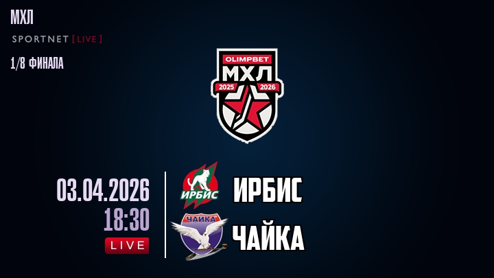 3 апреля 2026 года, мы предлагаем посмотреть онлайн трансляцию хоккейного матча между хоккейным клубом Ирбис и хоккейным клубом Чайка, проходящего в рамках Серии 1/8 финала ПЛЕЙ-ОФФ чемпионата МХЛ.