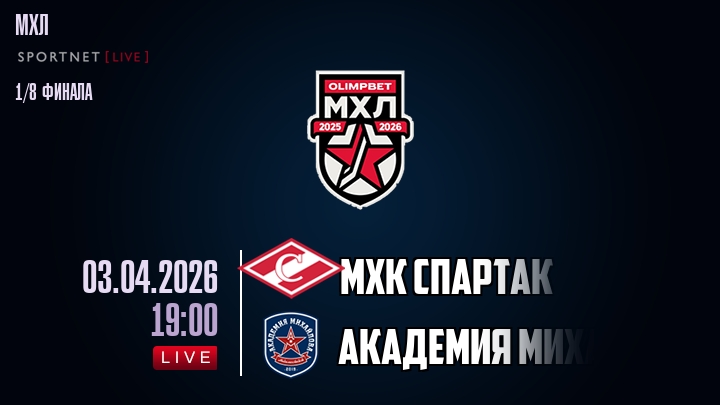 3 апреля 2026 года, мы предлагаем посмотреть онлайн трансляцию хоккейного матча между хоккейным клубом МХК Спартак и хоккейным клубом Академия Михайлова, проходящего в рамках Серии 1/8 финала ПЛЕЙ-ОФФ чемпионата МХЛ.