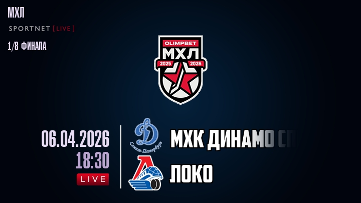 6 апреля 2026 года, мы предлагаем посмотреть онлайн трансляцию хоккейного матча между хоккейным клубом МХК Динамо Спб и хоккейным клубом Локо, проходящего в рамках Серии 1/8 финала ПЛЕЙ-ОФФ чемпионата МХЛ.