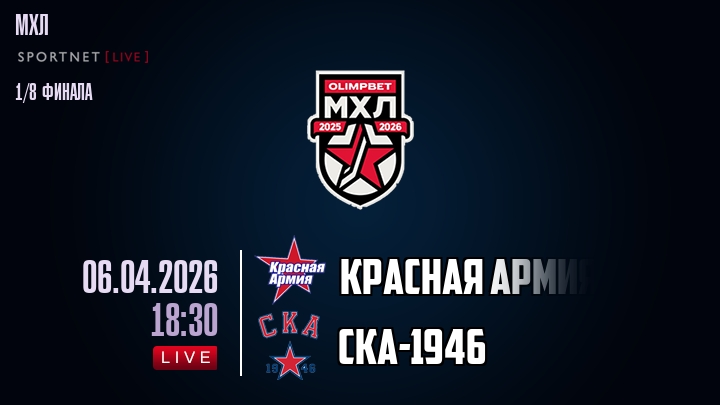 6 апреля 2026 года, мы предлагаем посмотреть онлайн трансляцию хоккейного матча между хоккейным клубом Красная Армия и хоккейным клубом СКА-, проходящего в рамках Серии 1/8 финала ПЛЕЙ-ОФФ чемпионата МХЛ.