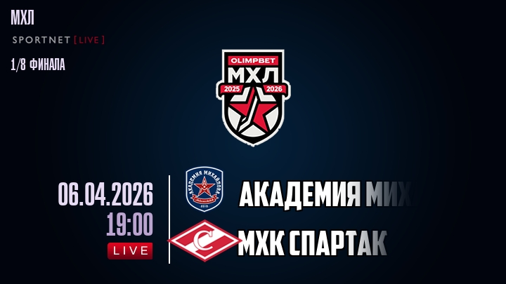 6 апреля 2026 года, мы предлагаем посмотреть онлайн трансляцию хоккейного матча между хоккейным клубом Академия Михайлова и хоккейным клубом МХК Спартак, проходящего в рамках Серии 1/8 финала ПЛЕЙ-ОФФ чемпионата МХЛ.