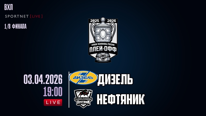 3 апреля 2026 года, мы предлагаем посмотреть онлайн трансляцию хоккейного матча между хоккейным клубом Дизель и хоккейным клубом Нефтяник, проходящего в рамках Серии 1/8 финала ПЛЕЙ-ОФФ чемпионата ВХЛ.