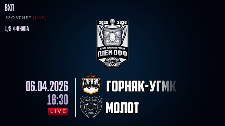 6 апреля 2026 года, мы предлагаем посмотреть онлайн трансляцию хоккейного матча между хоккейным клубом Горняк-УГМК и хоккейным клубом Молот, проходящего в рамках Серии 1/8 финала ПЛЕЙ-ОФФ чемпионата ВХЛ.