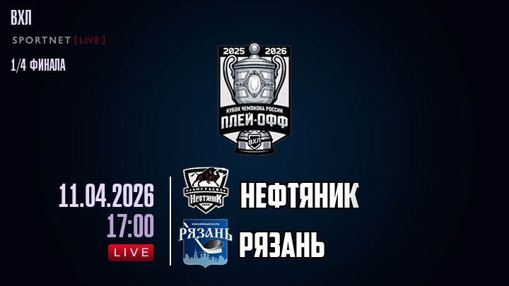11 апреля 2026 года, мы предлагаем посмотреть онлайн трансляцию хоккейного матча между хоккейным клубом Нефтяник и хоккейным клубом Рязань, проходящего в рамках Серии 1/4 финала ПЛЕЙ-ОФФ чемпионата ВХЛ.