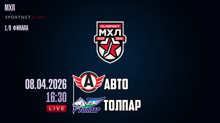 Сегодня, 8 апреля 2026 года, мы предлагаем посмотреть онлайн трансляцию хоккейного матча между хоккейным клубом Авто и хоккейным клубом Толпар, проходящего в рамках Серии 1/8 финала ПЛЕЙ-ОФФ чемпионата МХЛ.