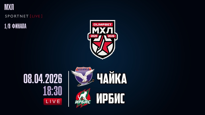 Сегодня, 8 апреля 2026 года, мы предлагаем посмотреть онлайн трансляцию хоккейного матча между хоккейным клубом Чайка и хоккейным клубом Ирбис, проходящего в рамках Серии 1/8 финала ПЛЕЙ-ОФФ чемпионата МХЛ.