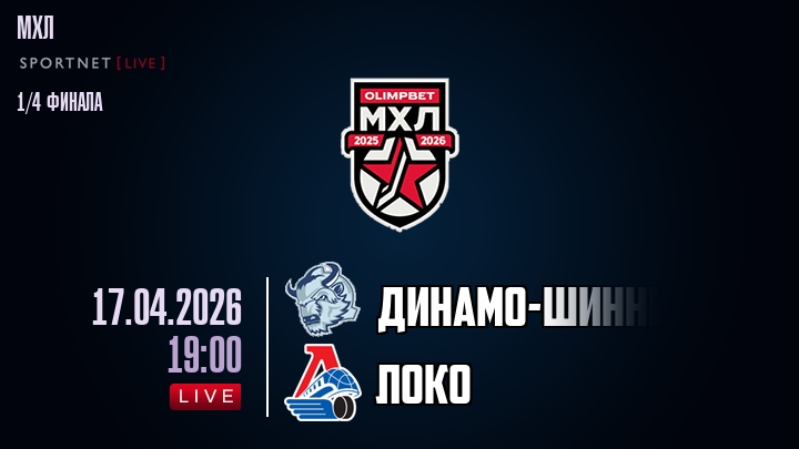 17 апреля 2026 года, мы предлагаем посмотреть онлайн трансляцию хоккейного матча между хоккейным клубом Динамо-Шинник и хоккейным клубом Локо, проходящего в рамках Серии 1/4 финала ПЛЕЙ-ОФФ чемпионата МХЛ.
