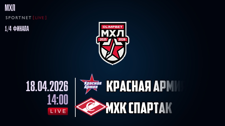 Сегодня, 18 апреля 2026 года, мы предлагаем посмотреть онлайн трансляцию хоккейного матча между хоккейным клубом Красная Армия и хоккейным клубом МХК Спартак, проходящего в рамках Серии 1/4 финала ПЛЕЙ-ОФФ чемпионата МХЛ.