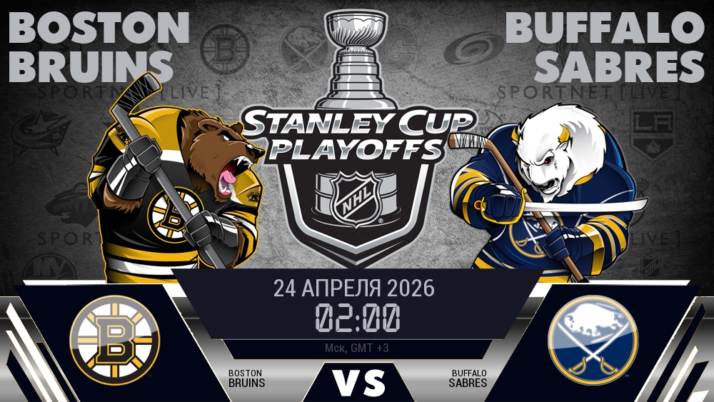 24 апреля 2026 года, мы предлагаем посмотреть онлайн трансляцию хоккейного матча между хоккейным клубом Бостон Брюинз и хоккейным клубом Баффало Сэйбрз, проходящего в рамках Серии 1/8 финала ПЛЕЙ-ОФФ чемпионата NHL.
