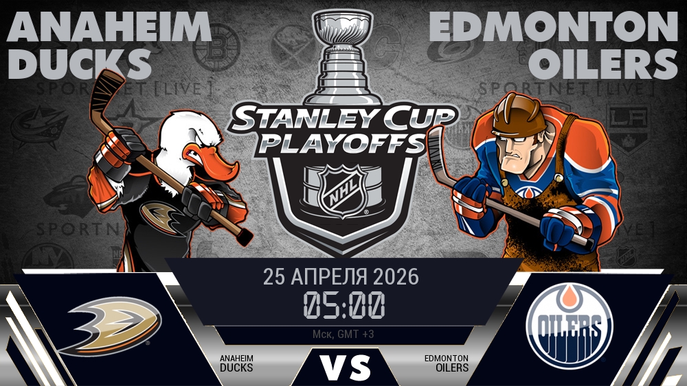 25 апреля 2026 года, мы предлагаем посмотреть онлайн трансляцию хоккейного матча между хоккейным клубом Анахайм Дакс и хоккейным клубом Эдмонтон Ойлерз, проходящего в рамках Серии 1/8 финала ПЛЕЙ-ОФФ чемпионата NHL.