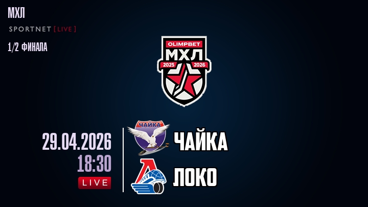29 апреля 2026 года, мы предлагаем посмотреть онлайн трансляцию хоккейного матча между хоккейным клубом Чайка и хоккейным клубом Локо, проходящего в рамках Серии 1/2 финала ПЛЕЙ-ОФФ чемпионата МХЛ.
