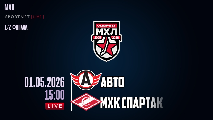 1 мая 2026 года, мы предлагаем посмотреть онлайн трансляцию хоккейного матча между хоккейным клубом Авто и хоккейным клубом МХК Спартак, проходящего в рамках Серии 1/2 финала ПЛЕЙ-ОФФ чемпионата МХЛ.