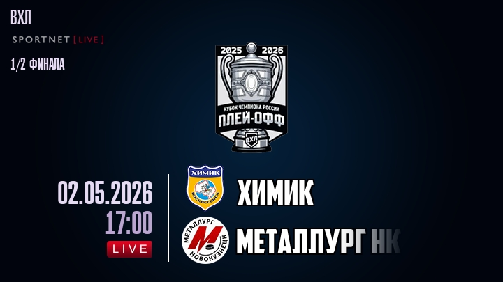 2 мая 2026 года, мы предлагаем посмотреть онлайн трансляцию хоккейного матча между хоккейным клубом Химик и хоккейным клубом Металлург Нк, проходящего в рамках Серии 1/2 финала ПЛЕЙ-ОФФ чемпионата ВХЛ.