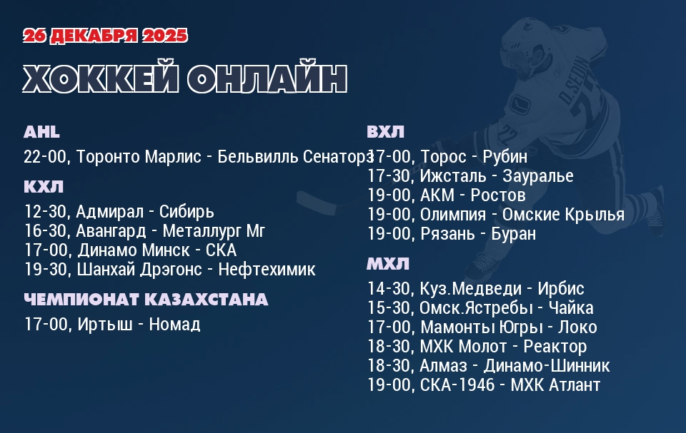 В 12-30 команда «Адмирал» на домашнем льду принимает команду «Сибирь». В прошлой встрече между командой Сибирь и командой Адмирал, которая состоялась 6 января 2026 года - победу в основное время со счетом 5:2 одержала команда Сибирь. В турнирной таблице Восточной конференции КХЛ команда Адмирал занимает 11-е место, а команда Сибирь занимает 8-е место.