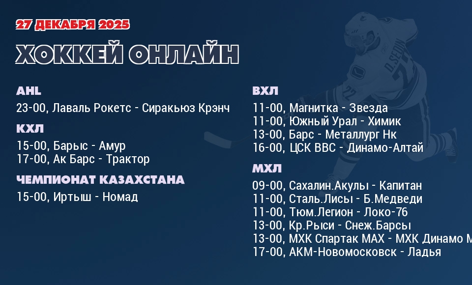 В 11-00 команда «Магнитка» играет с командой «Звезда». В прошлой встрече между командой Магнитка и командой Звезда, которая состоялась 27 декабря 2025 года - победу в основное время со счетом 1:0 одержала команда Звезда. В турнирной таблице ВХЛ команда Магнитка занимает 5-е место, а команда Звезда занимает 21-е место.