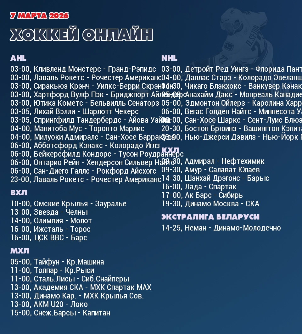 В 13-00 «Академия Михайлова U20» играет с командой «Локо». В прошлой встрече между командой Академия Михайлова U20 и командой Локо, которая состоялась 9 марта 2026 года - победу в овертайме со счетом 2:1 одержала команда Академия Михайлова U20. В турнирной таблице МХЛ команда Академия Михайлова занимает 1-е место, а команда Локо занимает 1-е место Западной конференции.
