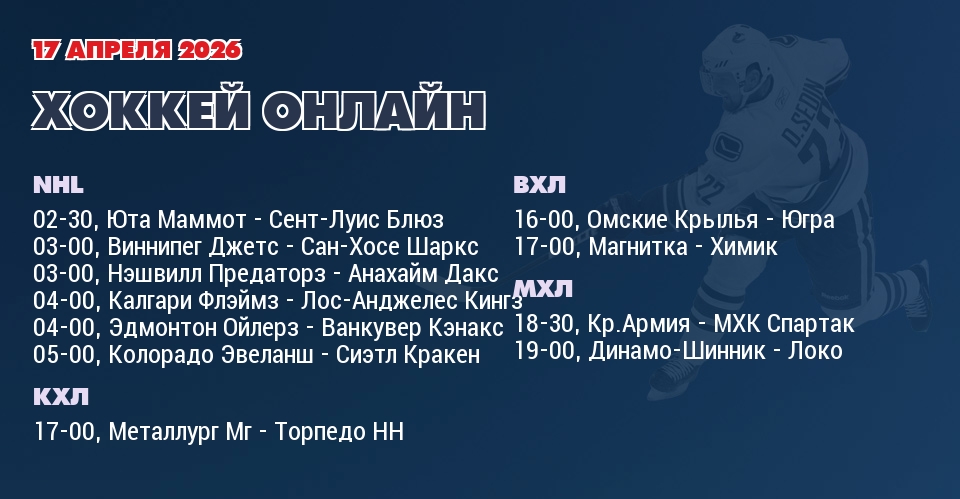 В 17-00 команда «Металлург Мг» на домашнем льду принимает команду «Торпедо НН». В прошлой встрече между командой Торпедо НН и командой Металлург Мг, которая состоялась 15 апреля 2026 года - победу в овертайме со счетом 3:2 одержала команда Торпедо НН. В турнирной таблице Восточной конференции КХЛ команда Металлург Мг занимает 1-е место, а команда Торпедо НН занимает 6-е место Западной конференции.