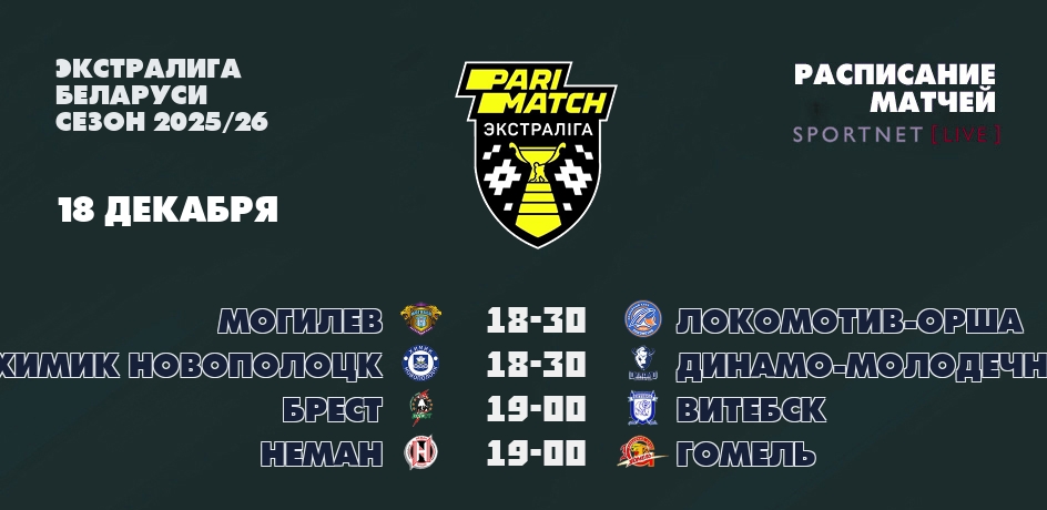 Сегодня, 18 декабря 📺 прямые трансляции Экстралиги Беларуси: ✔18-30 Могилев - Локомотив-Орша, ✔18-30 Химик Новополоцк - Динамо-Молодечно, ✔19-00 Брест - Витебск, ✔19-00 Неман - Гомель...