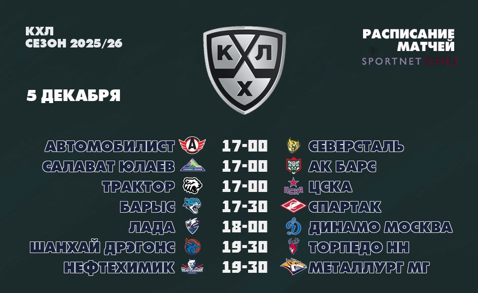 Сегодня, 5 декабря 📺 прямые трансляции чемпионата КХЛ: ✔17-00 Автомобилист - Северсталь, ✔17-00 Салават Юлаев - Ак Барс, ✔17-00 Трактор - ЦСКА, ✔17-30 Барыс - Спартак...