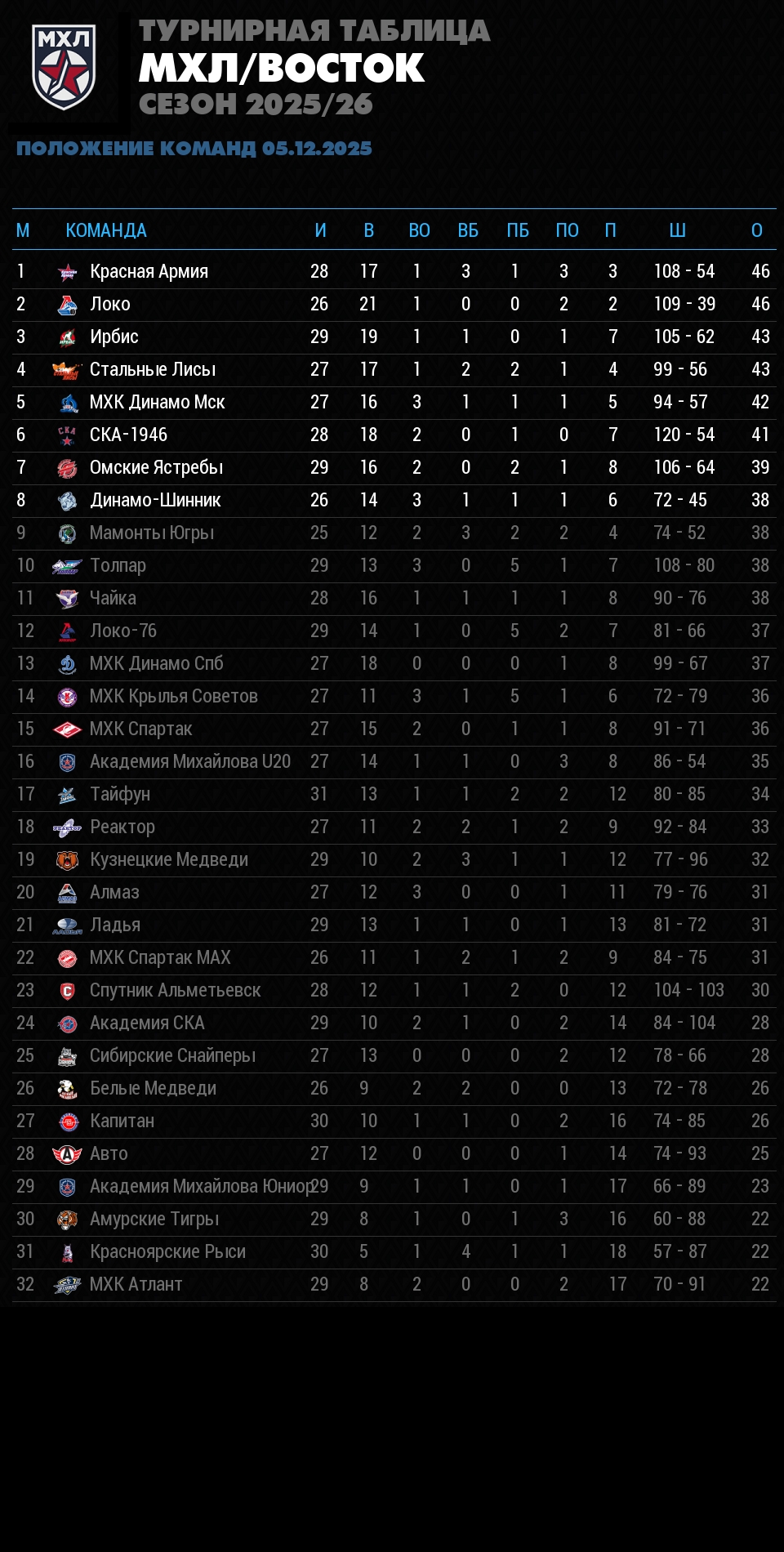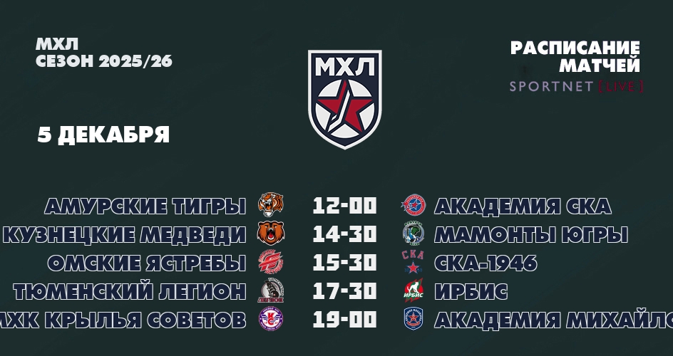 Сегодня, 5 декабря 📺 прямые трансляции чемпионата МХЛ: ✔12-00 Амурские Тигры - Академия СКА, ✔14-30 Кузнецкие Медведи - Мамонты Югры, ✔15-30 Омские Ястребы - СКА-1946, ✔17-30 Тюменский Легион - Ирбис...