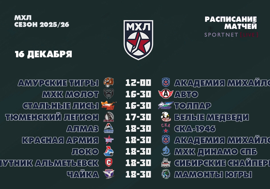 Сегодня, 16 декабря 📺 прямые трансляции чемпионата МХЛ: ✔12-00 Амурские Тигры - Академия Михайлова Юниор, ✔16-30 МХК Молот - Авто, ✔16-30 Стальные Лисы - Толпар, ✔17-30 Тюменский Легион - Белые Медведи...