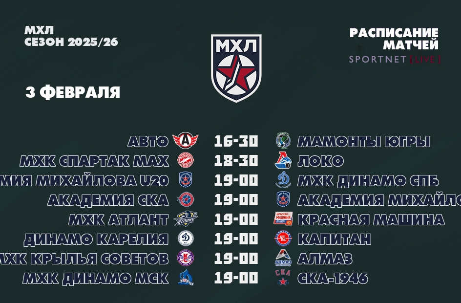 Сегодня, 3 февраля 📺 прямые трансляции чемпионата МХЛ: ✔16-30 Авто - Мамонты Югры, ✔18-30 МХК Спартак МАХ - Локо, ✔19-00 Академия Михайлова U20 - МХК Динамо Спб, ✔19-00 Академия СКА - Академия Михайлова Юниор...
