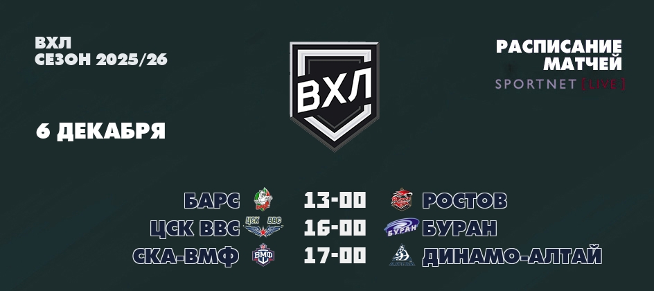 Сегодня, 6 декабря 📺 прямые трансляции чемпионата ВХЛ: ✔13-00 Барс - Ростов, ✔16-00 ЦСК ВВС - Буран, ✔17-00 СКА-ВМФ - Динамо-Алтай...
