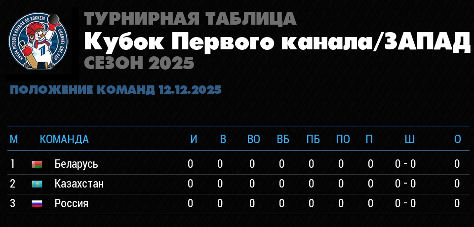 Положение команд в турнирной таблице Кубка Первого канала на 12 декабря 2025. Учтены все сыгранные матчи, количество побед и поражений, разница заброшенных и пропущенных шайб, и соответственно количество набранных очков.
