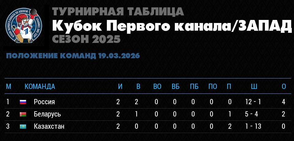 Положение команд в турнирной таблице Кубка Первого канала на 19 марта 2026. Учтены все сыгранные матчи, количество побед и поражений, разница заброшенных и пропущенных шайб, и соответственно количество набранных очков.