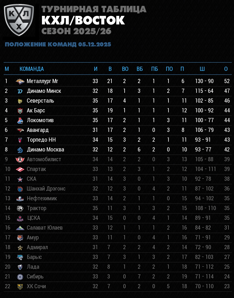 Положение команд в турнирной таблице чемпионата КХЛ на 5 декабря 2025. Учтены все сыгранные матчи, количество побед и поражений, разница заброшенных и пропущенных шайб, и соответственно количество набранных очков.