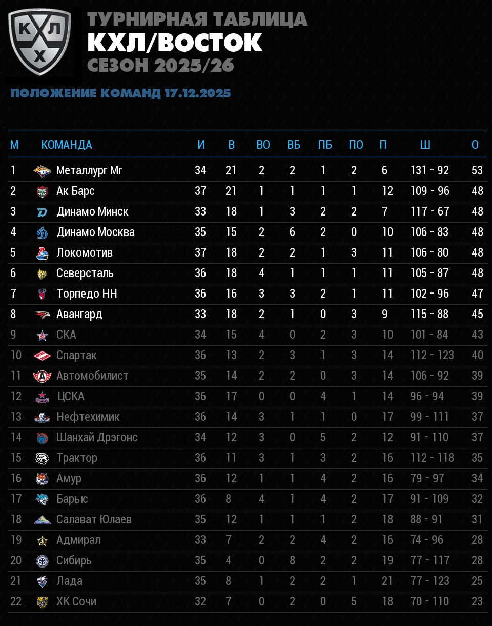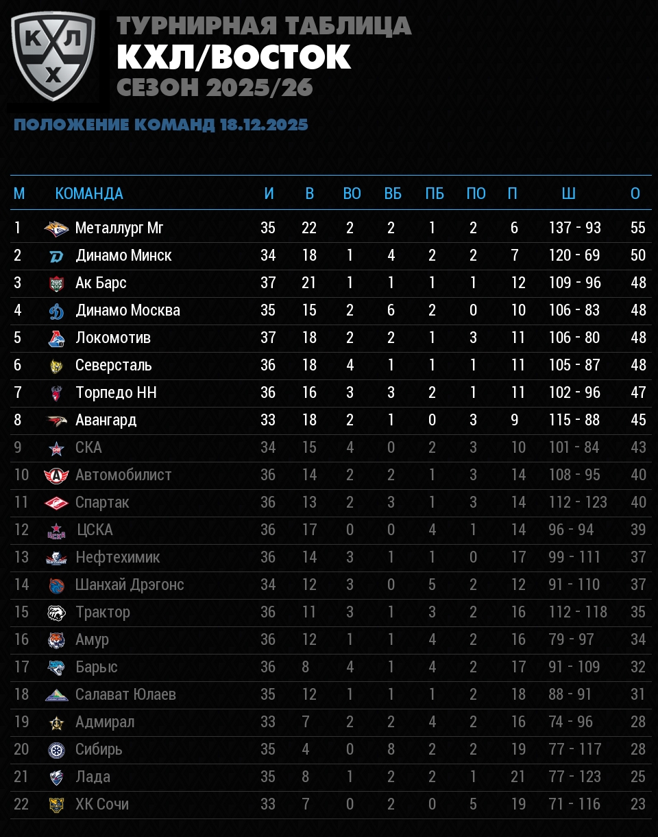 Положение команд в турнирной таблице чемпионата КХЛ на 18 декабря 2025. Учтены все сыгранные матчи, количество побед и поражений, разница заброшенных и пропущенных шайб, и соответственно количество набранных очков.