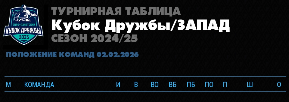 Положение команд в турнирной таблице Кубок Дружбы на 1 февраля 2026. Учтены все сыгранные матчи, количество побед и поражений, разница заброшенных и пропущенных шайб, и соответственно количество набранных очков.