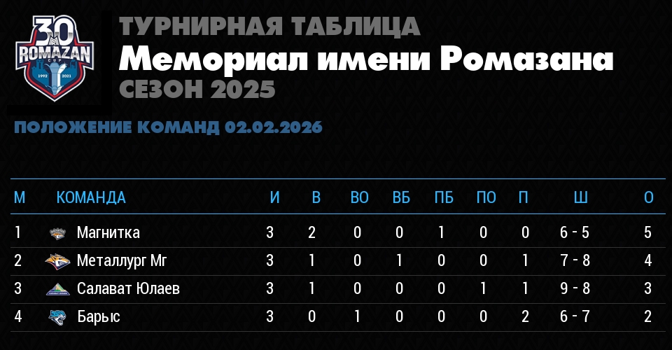 Положение команд в турнирной таблице Мемориала имени Ромазана на 2 февраля 2026. Учтены все сыгранные матчи, количество побед и поражений, разница заброшенных и пропущенных шайб, и соответственно количество набранных очков.
