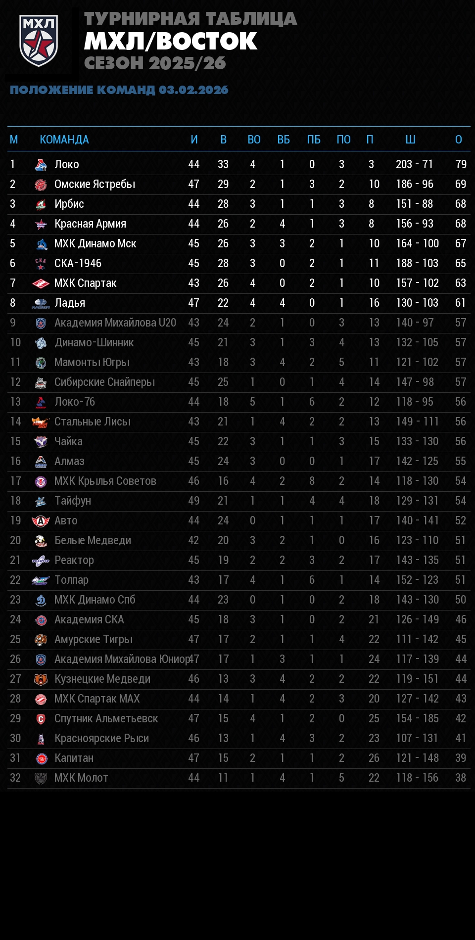 Положение команд в турнирной таблице чемпионата МХЛ на 3 февраля 2026. Учтены все сыгранные матчи, количество побед и поражений, разница заброшенных и пропущенных шайб, и соответственно количество набранных очков.