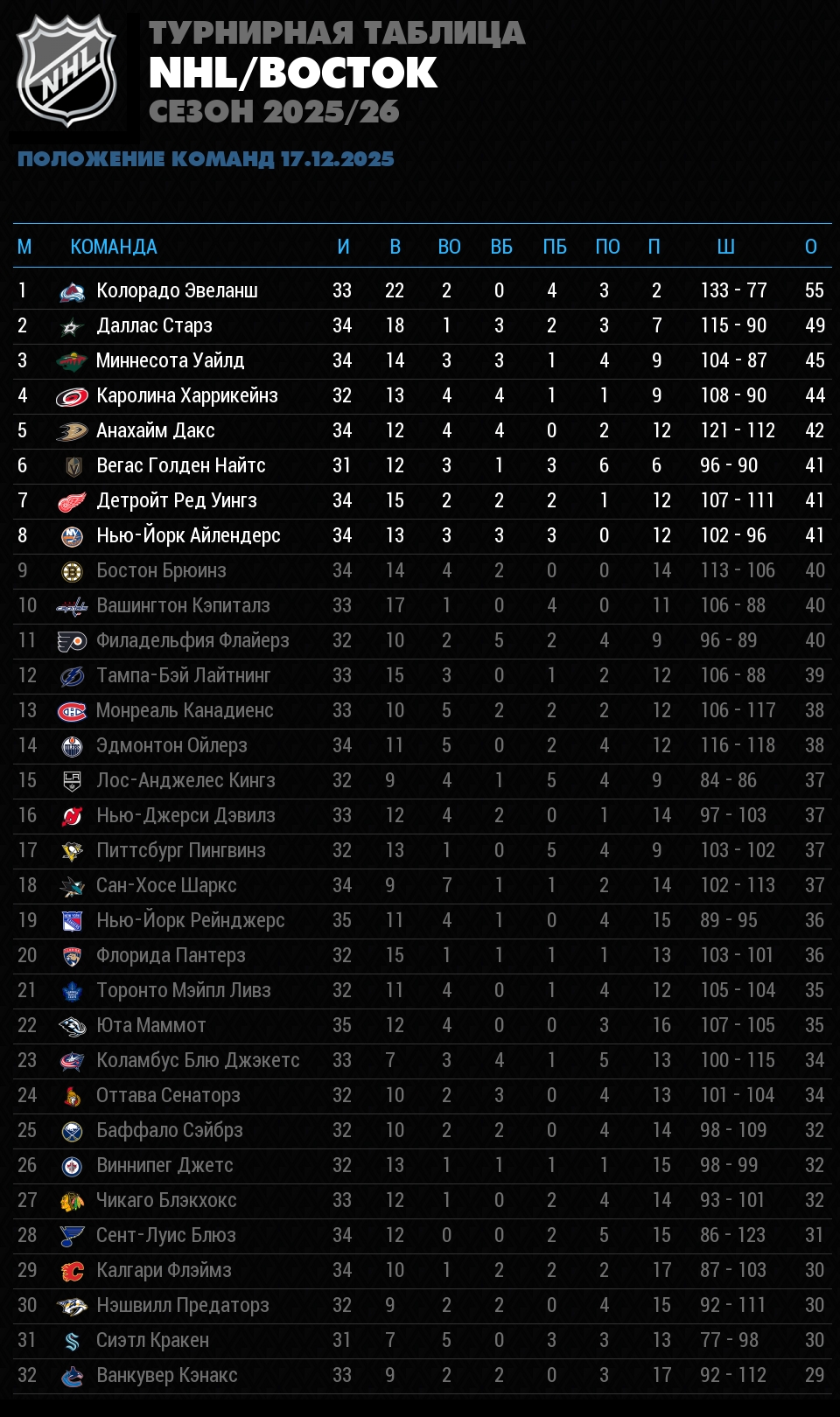 Положение команд в турнирной таблице чемпионата NHL на 17 декабря 2025. Учтены все сыгранные матчи, количество побед и поражений, разница заброшенных и пропущенных шайб, и соответственно количество набранных очков.