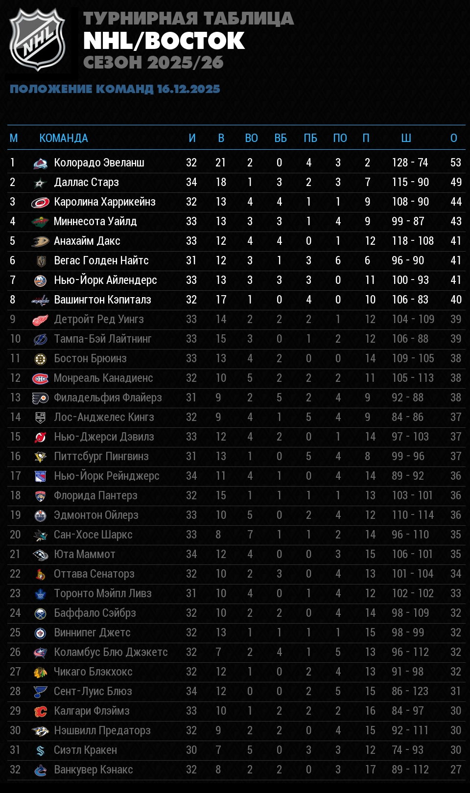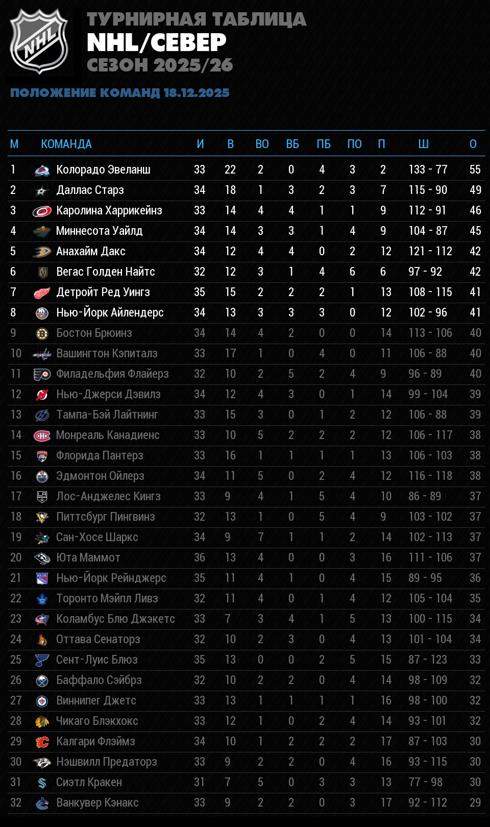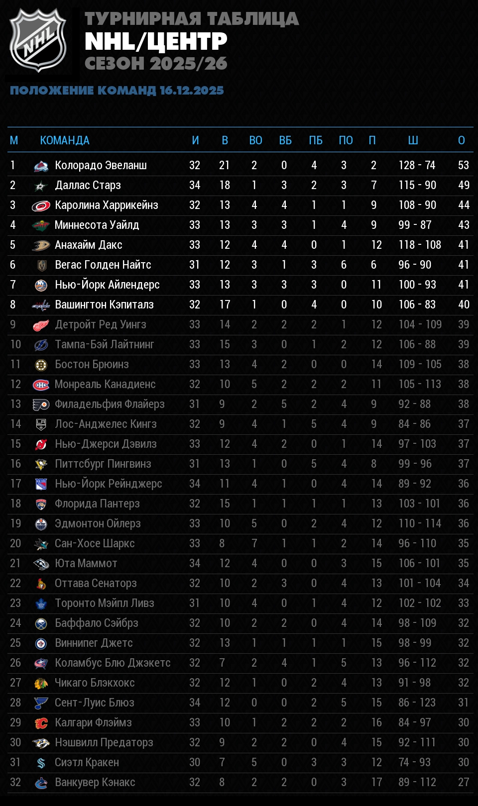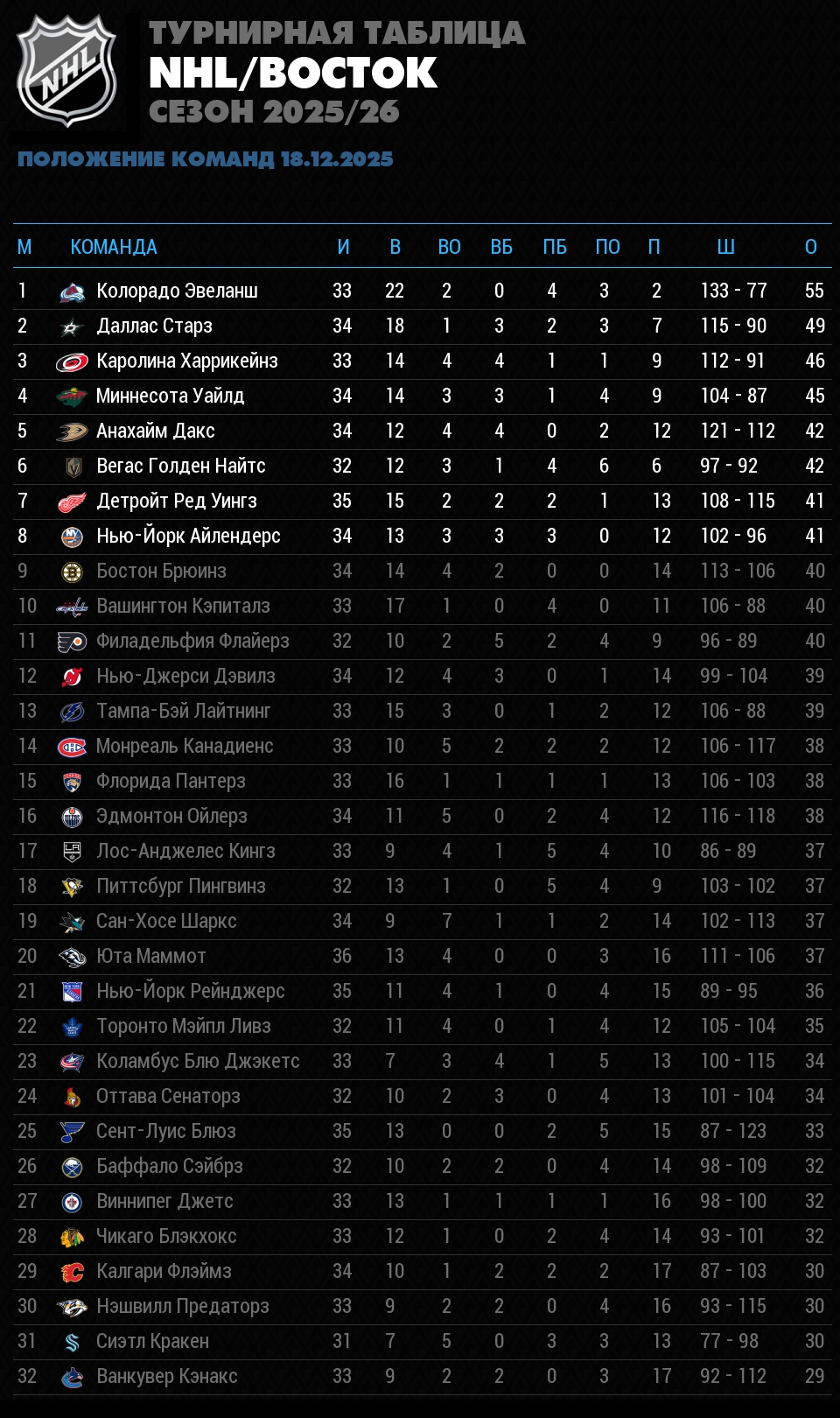 Положение команд в турнирной таблице чемпионата NHL на 17 декабря 2025. Учтены все сыгранные матчи, количество побед и поражений, разница заброшенных и пропущенных шайб, и соответственно количество набранных очков.