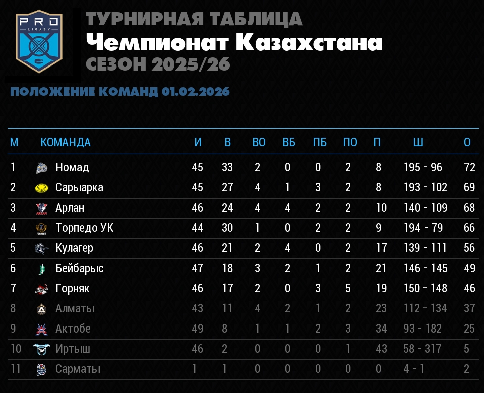 Положение команд в турнирной таблице чемпионата Казахстана на 1 февраля 2026. Учтены все сыгранные матчи, количество побед и поражений, разница заброшенных и пропущенных шайб, и соответственно количество набранных очков.