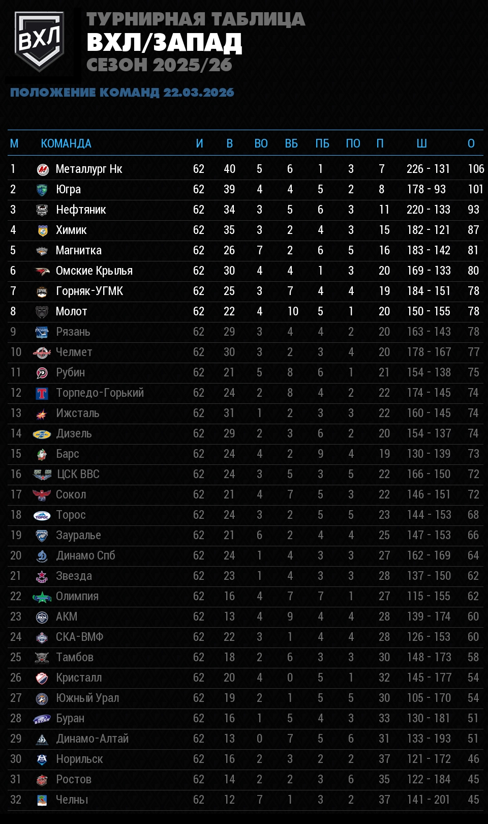Положение команд в турнирной таблице чемпионата ВХЛ на 22 марта 2026. Учтены все сыгранные матчи, количество побед и поражений, разница заброшенных и пропущенных шайб, и соответственно количество набранных очков.