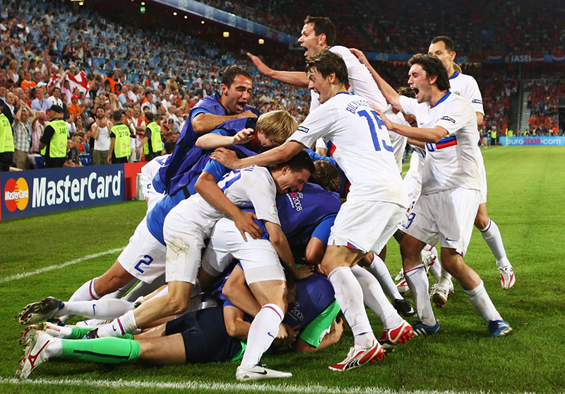 После распада СССР 1990-е годы стали сложным периодом для российского футбола: уход игроков за границу, слабая инфраструктура, пустые трибуны. Однако в 2008 году под руководством Гуса Хиддинка сборная России вернула веру болельщиков. На Евро-2008 победа над Нидерландами (3:1) в четвертьфинале стала сенсацией. Андрейblich: Андрей Аршавин, Роман Павлюченко и Дмитрий Торбинский блестяще провели матч, а команда завоевала бронзовые медали — первый крупный успех постсоветской России.