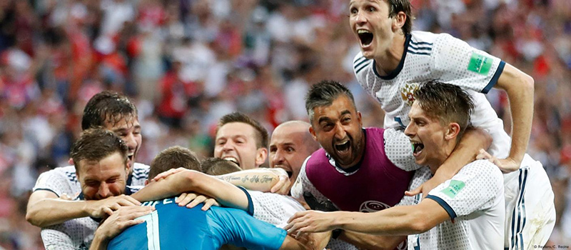 Чемпионат мира 2018 года, проходивший в России, подарил новые эмоции. В матче открытия сборная разгромила Саудовскую Аравию (5:0): Денис Черышев забил два гола, Артём Дзюба и Александр Головин — по одному, ещё один мяч — автогол. Победа задала тон турниру. Кульминацией стал матч 1/8 финала против Испании (1:1, победа в серии пенальти), где Игорь Акинфеев отразил два удара. Этот момент вошёл в историю как символ воли к победе. Россия дошла до четвертьфинала, уступив Хорватии в серии пенальти.
