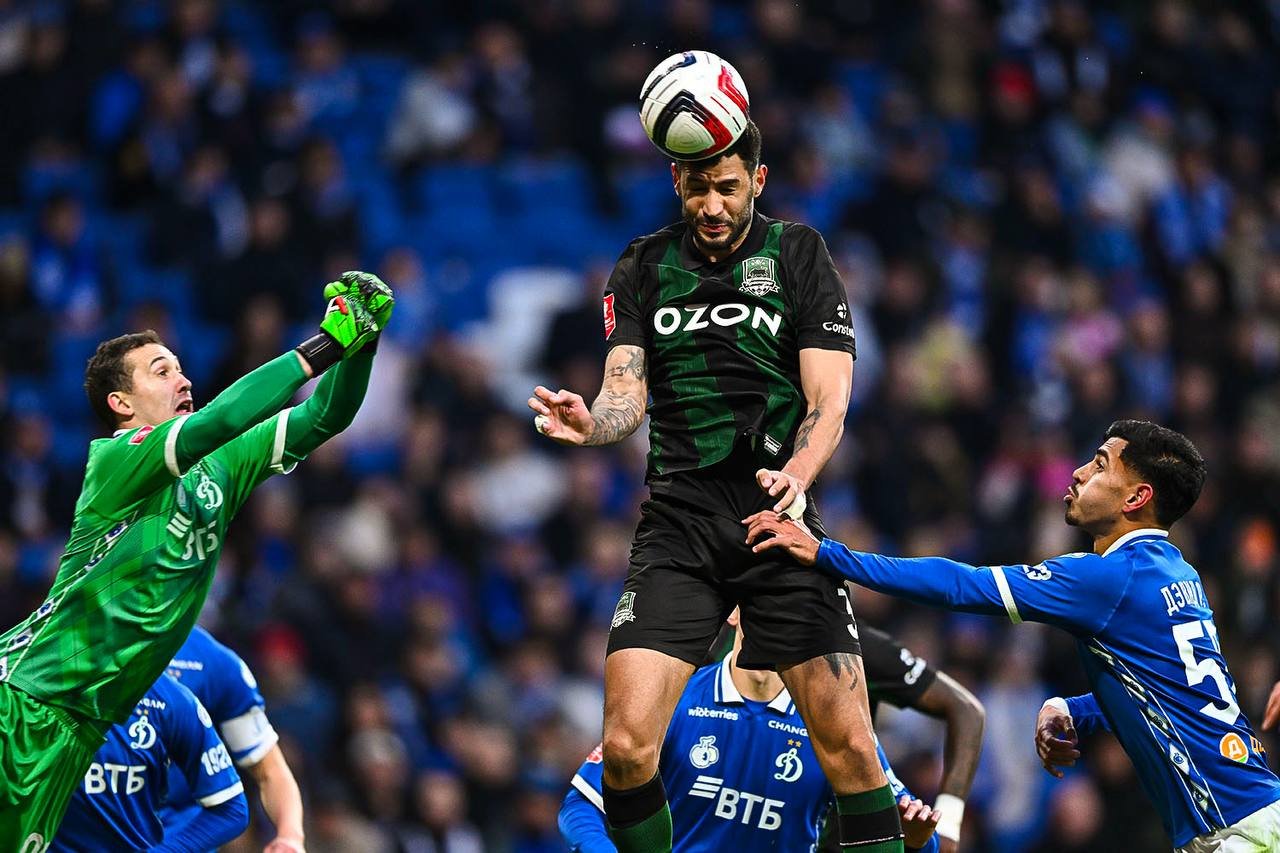 В концовке хозяева были близки к победе: Константин Тюкавин отправил мяч в сетку на 90+7-й минуте, однако взятие ворот отменили из-за положения вне игры.Отметим, что в компенсированное время "Краснодар" остался в меньшинстве - вторую жёлтую получил Александр Черников.Ответная встреча состоится 5 мая в Краснодаре.Кубок РоссииПуть РПЛ. Финал. Первый матч"Динамо": Лунёв, Маричаль, Рикардо, Фернандес (Скопинцев, 45), Касерес, Рубенс (Маринкин, 61), Фомин, Гладышев (Миранчук, 46), Бителло (Артур Гомес, 82), Нгамалё, Тюкавин."Краснодар": Агкацев, Пальцев (Гонсалес, 46), Жубал, Тормена (Диего Коста, 46), Оласа (Хмарин, 55), Черников, Кривцов, Сперцян, Батчи, Боселли (Гусейнов, 85), Мозес (Кордоба, 46).Предупреждения: Оласа, 17, Касерес, 26, Черников, 28, Пальцев, 44, Нгамалё, 52, Миранчук, 71.Удаление: Черников, 90+1.