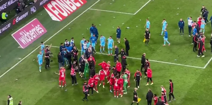 Победа гостей в серии пенальти вызвала резкую реакцию трибун. Рядом с сектором активных болельщиков хозяев в сторону игроков "Спартака" полетели пластиковые бутылки с водой.Футболисты московской команды ответили жестами в адрес трибун, после чего игроки "Зенита" вмешались и призвали соперников покинуть поле.